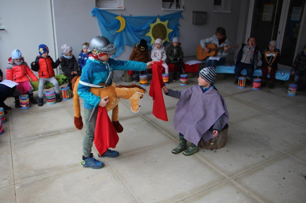 Wenn es draußen langsam dämmrig wird, feiern wir das Martinsfest. Dabei steht der heilige Martin im Mittelpunkt, der vor vielen Jahren am Stadttor seinen Mantel mit dem Bettler geteilt hat. Jede Gruppe feiert dieses Fest im Garten des Kindergartens.