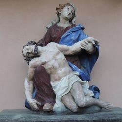 Die Pietastatue ist jährlich am ersten Bitttag Ausgangspunkt für die Bittprozession, die über den Franziskusbrunnen und die Mariensäule zur Pfarrkirche führt.