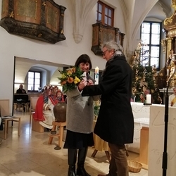 Vor dem Schlusssegen überreichte Ernst Pock im Namen der Pfarre dem neuen Diakon ein Aspergill, mit dem dieser gleich voll Freude die Gläubigen segnete. Für seine Ehefrau Eva, die ihm begleitend zur Seite steht, gab es einen Blumenstrauß, mit den besten Wünschen für sie.