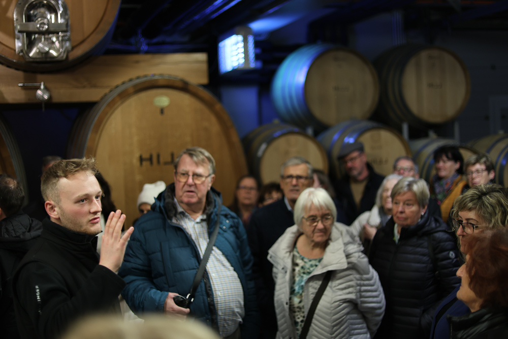 Zum krönenden Abschluss fuhren wir weiter nach Jois im Burgenland zum Weingut Leo Hillinger. Zuerst wurden wir durch den Weinkeller geführt. Zwischen Stahltanks und Barriquefässern konnten wir alle möglichen Fragen zum Wein und Weingut stellen. Im Gebäude darüber konnten wir mit Blick auf den Weinkeller vier Weine verkosten. Zur Stärkung durfte eine Jause dazu nicht fehlen.
